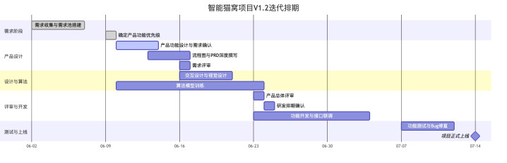 项目周期:202X年6月2日–7月14日(约1.5个月),正常的需求应该是这样提前规划并占位置,时间均需要去掉周末。